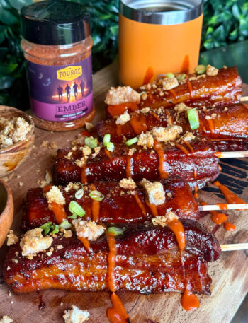 Sticky, smoky pork belly cooked low and slow with @fourge.bbq EMBER rub, braised until tender, skewered, dunked in glaze and tacked back up on the @ninjakitchenuk FlexFlame until it went dark, glossy and savage. Then finished with that bright orange pepper drizzle, crackling crumb and spring onion.